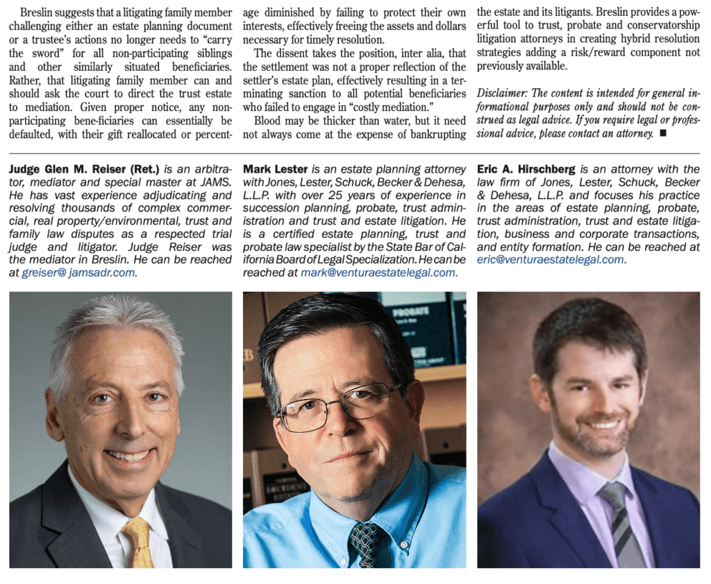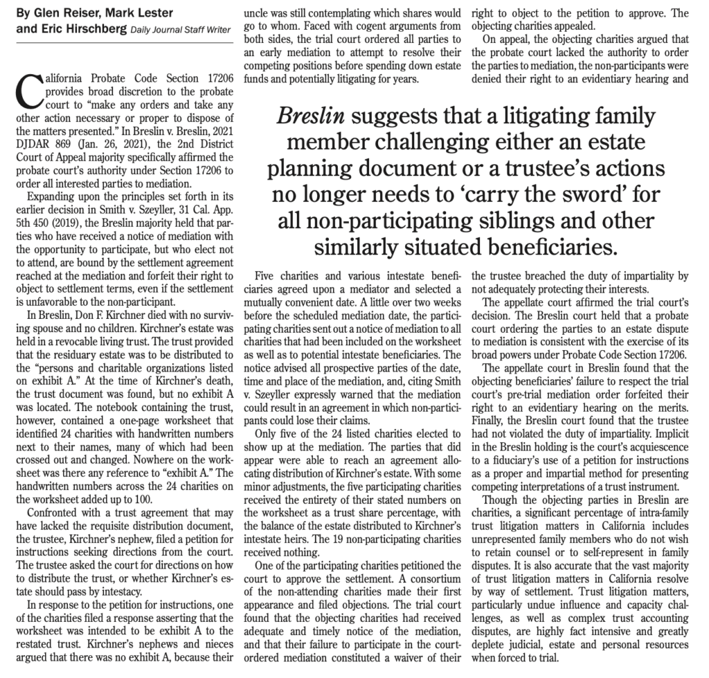 Our small firm is known throughout the state for our trust and estate litigation prowess, including successfully litigating such matters before the California Court of Appeals and co-authoring the compelling amicus brief in Barefoot v. Jennings (2020) 8 Cal.5th 822 cited by the California Supreme Court in reversing the erroneous lower court opinions denying standing to the appellant to pursue her right to challenge trust documents that purported to disinherit her. Most recently in the benchmark case Breslin v. Breslin (2021) 62 Cal.App.5th 801, our firm again changed trusts and estates litigation in California for the better. In Breslin, the Court of Appeal affirmed (and the California Supreme Court was persuaded to let stand) the right of the probate court to send the parties to an early mediation paid for by the trust; the ability of the probate court to find that parties, who received a notice of mediation with a warning of forfeiture or loss of potential interests if that party failed to participate, were unable thereafter to object to that mediated resolution; and that a fiduciary fulfills its obligations of impartiality and loyalty by filling a petition for instructions/construction rather than using the Trust assets to advocate for any particular potential beneficiary interests. All three holdings are matters of first impression, thus positively changing California trust litigation practice, yet consistent with our firm’s existing and over-arching goal to seek the most expeditious and cost-effective result for our clients involved in trusts and estates litigation. Most telling is that our firm’s efforts in Breslin have resulted a new “Breslin Notice” that virtually all California probate judges now require be given to all interested persons.